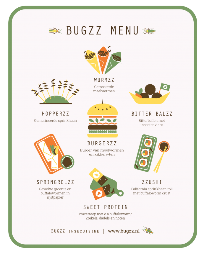 - Burgerzz: burger van meelwormen, kikkererwten, en verse kruiden op een broodje met spinazie, tomaat, augurk, ui, en een frisse yoghurt saus.